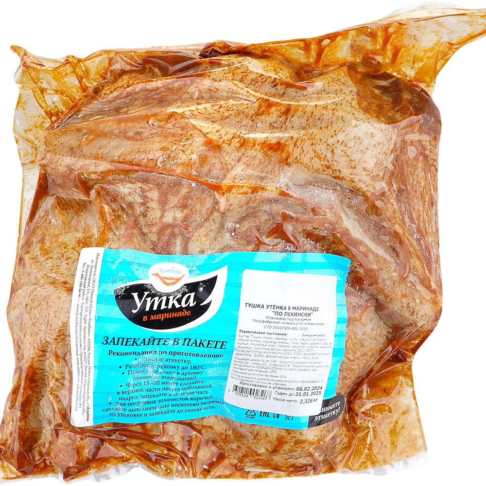 Части утки в традиционном азиатском маринаде с медом, соевым соусом и имбирем. Маринад создает узнаваемый вкус и хрустящую золотистую корочку при запекании. Готовое решение для ресторанов азиатской кухни и ценителей восточной кулинарии. Свежий продукт от надежного поставщика.